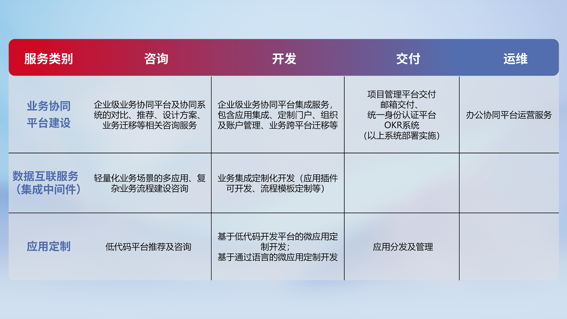 针对钉钉、、企微、、、、IDaas等平台级产品提供产品的规划、、、、方案、、交付、、、定制化开发等服务,,,实现如统一协同办公、、、、智能客户服务、、、、混合会议管理、、、智能数据查询、、、、等业务场景,,,,实现数字化转型。。。。
